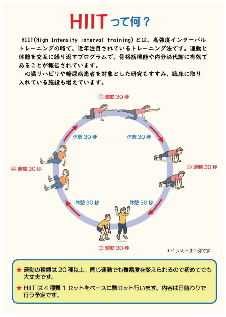 内容はストレッチやウォーミングアップ、高強度インターバルトレーニング(HIIT)などを組み合わせ、